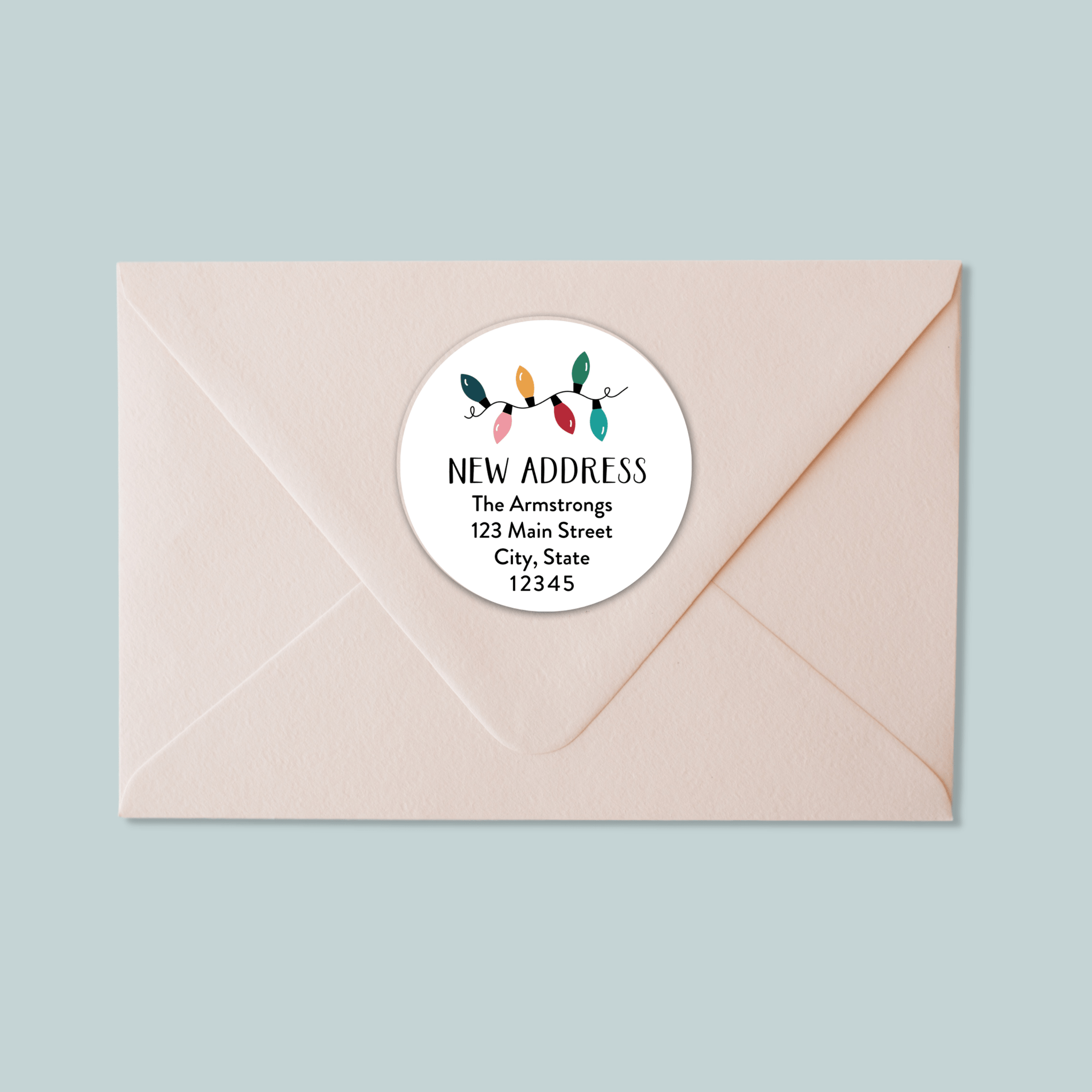 Send holiday cheer—and let everyone know you’ve moved—with our festive address labels. Featuring bright and colorful Christmas string lights—these round stickers are wonderful for sealing holiday cards with ease and flair!