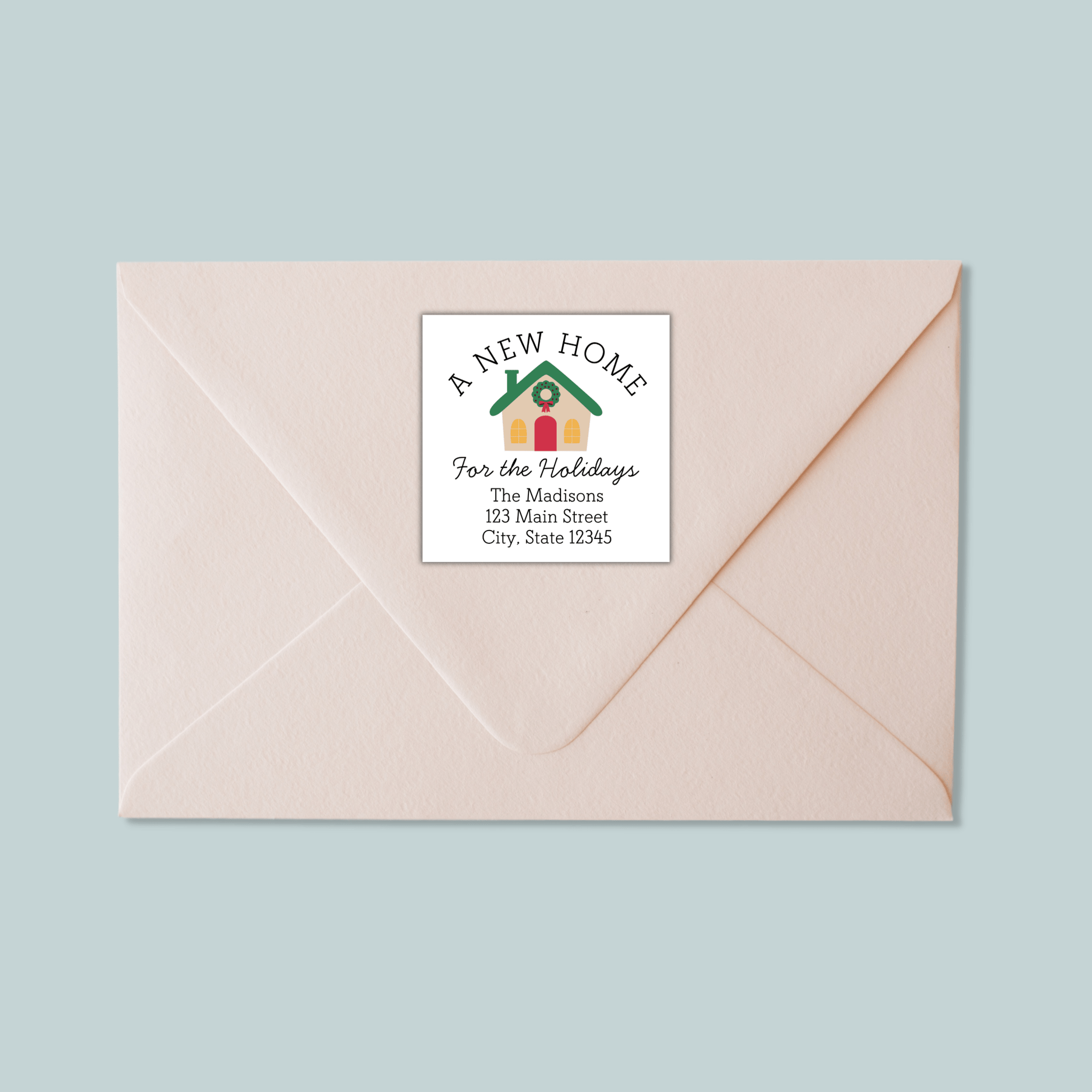 Announce your move in festive style with these charming square labels feature a welcoming house adorned with a classic wreath, perfectly blending the excitement of a new home with the warmth of the holiday season. Whether you're sending out change-of-address cards, holiday greetings, or simply want to add a personal touch to your correspondence during moving season, these labels make the task effortless and elegant.