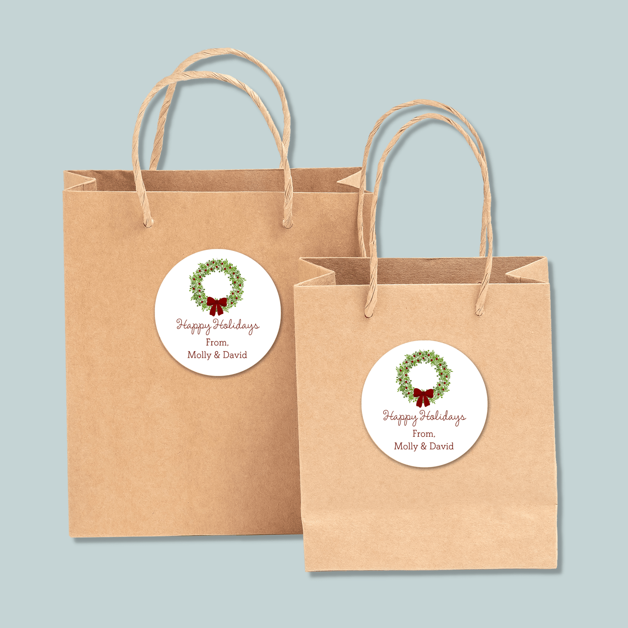 Warm and inviting, these personalized stickers feature a rustic leafy green wreath above a heartfelt "Happy Holidays" greeting. Customize with names, family names, or special messages to add a personal touch to all your seasonal gift-giving. Perfect for sealing gift bags, decorating presents, embellishing holiday cards, or adding natural, organic charm to packages and party favors. A versatile, inclusive design that welcomes everyone into the spirit of the season with timeless botanical elegance.