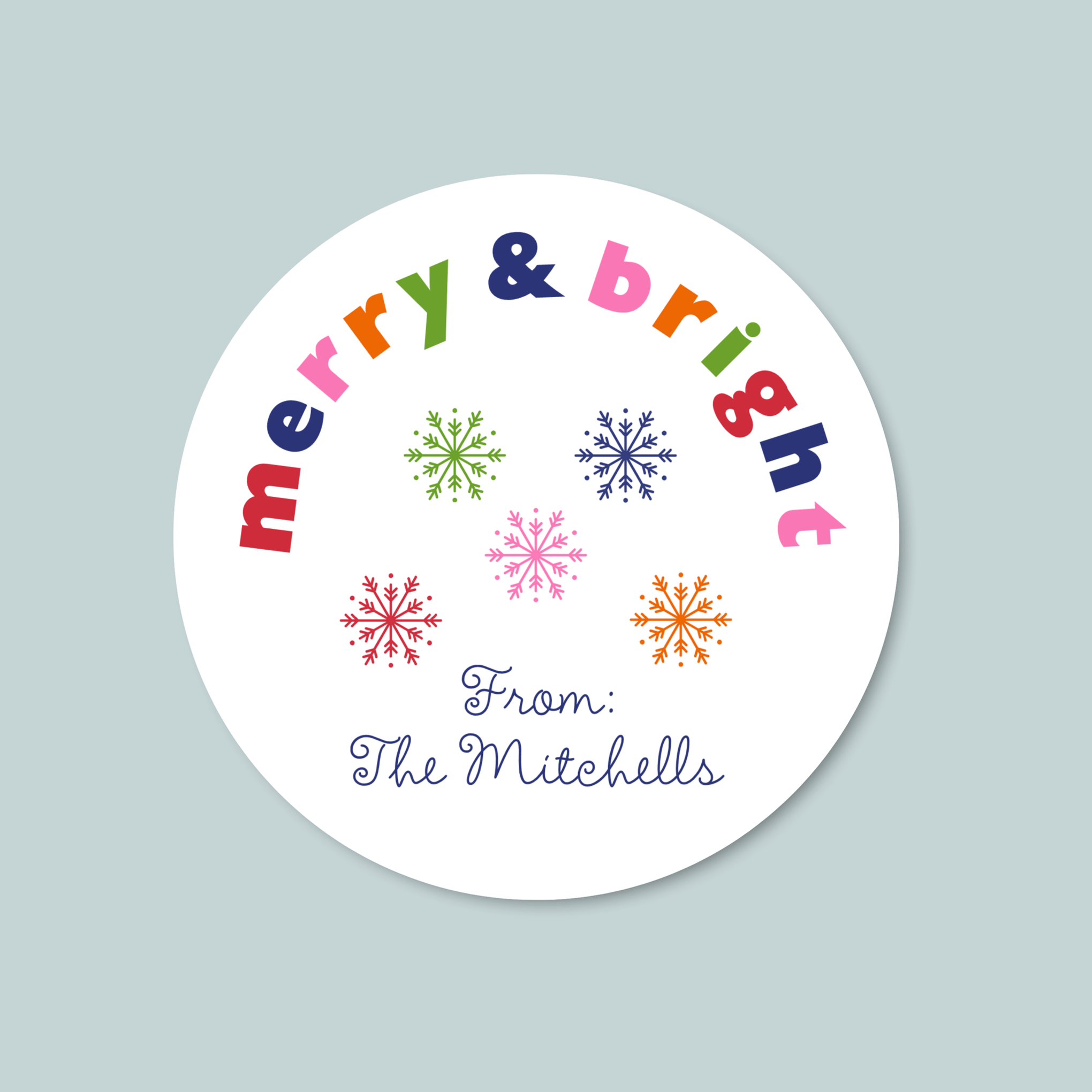 Cheerful and festive, these vibrant stickers feature a joyful "Merry and Bright" message surrounded by colorful snowflakes that sparkle with holiday cheer. Customize with names, family names, or special messages to add a playful, personalized touch to all your Christmas gift-giving. Perfect for sealing gift bags, decorating presents, embellishing holiday cards, or adding whimsical winter charm to packages and party favors. A fun, uplifting design that brings the magic and merriment of the season to every gift!