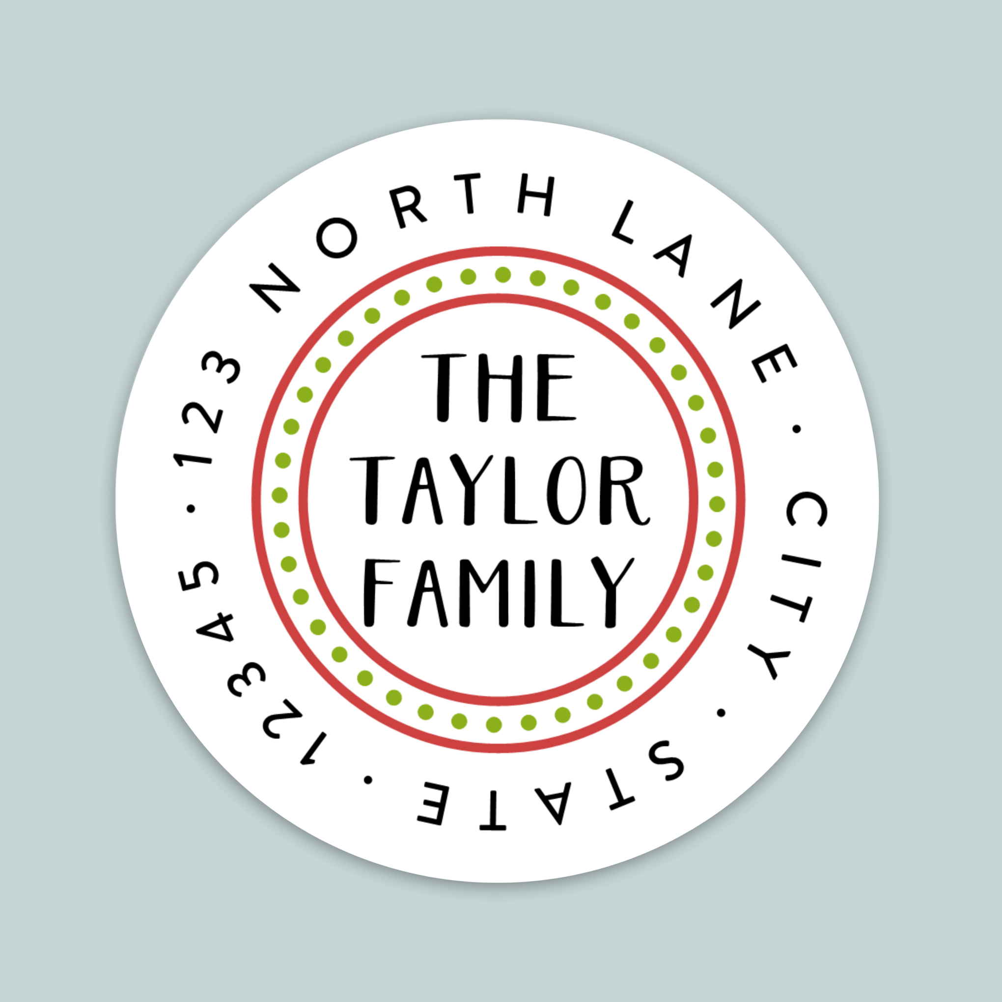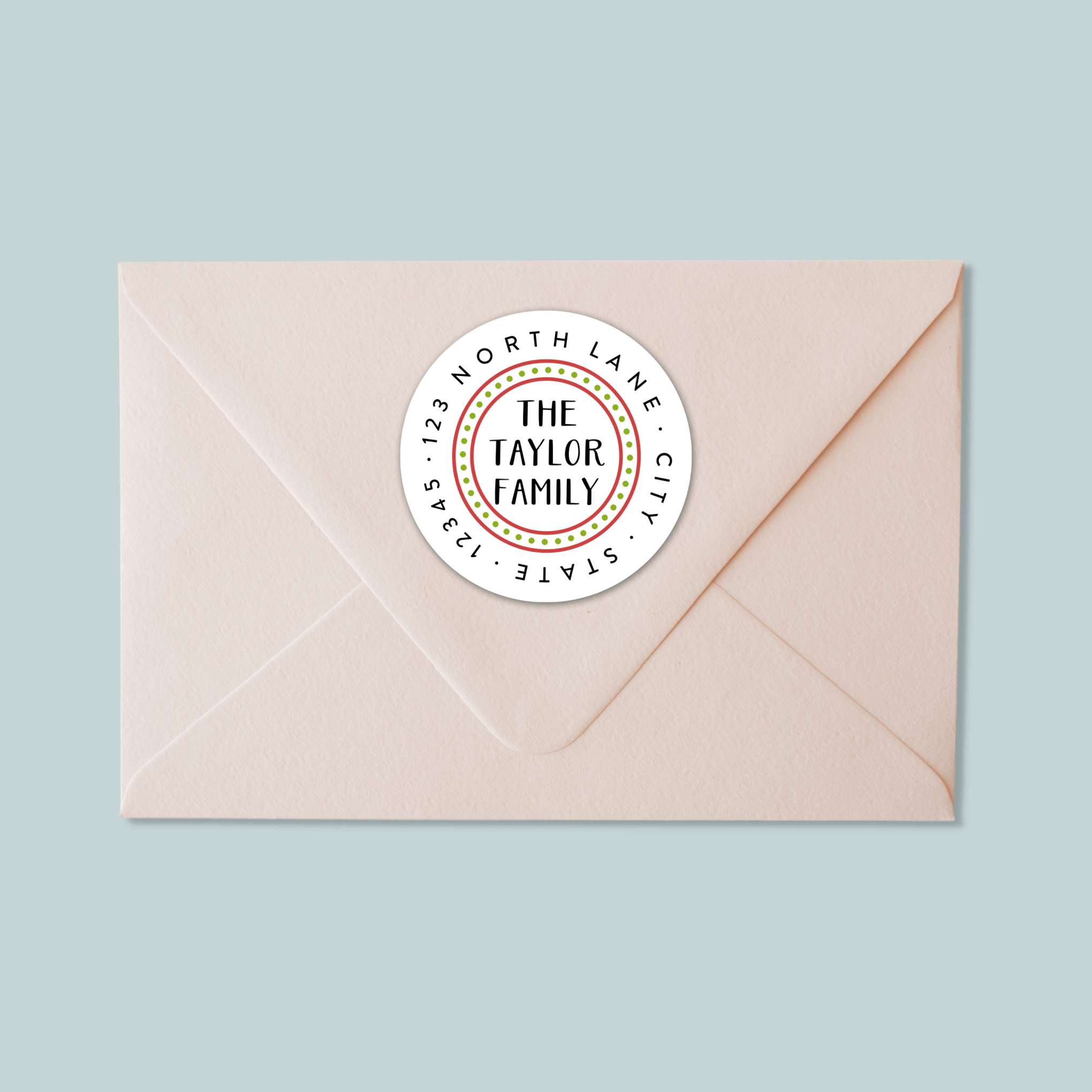 Classic and cheerful, these festive round address labels feature a playful red and green dotted border with your family name prominently displayed in the center and return address elegantly wrapped around the outer edge. Perfect for holiday mailings—Christmas cards, seasonal greetings, party invitations, or year-end correspondence. The traditional holiday colors and whimsical dotted design create a warm, welcoming look that makes every envelope feel merry and bright. A charming way to send season's greetings with personalized style!