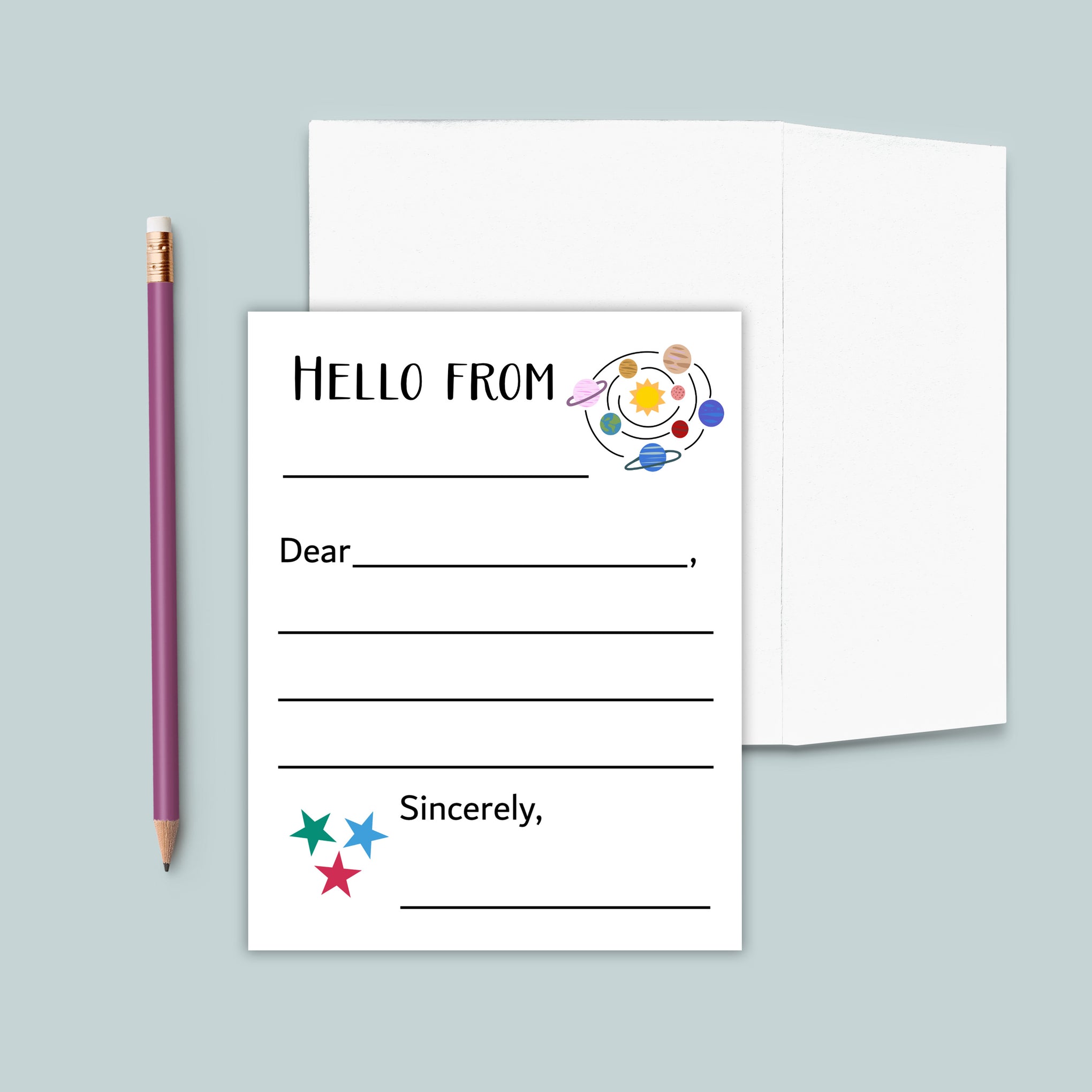 Hand drawn outer space planets with stars design featuring simple lines that make writing notes easy and fun for young children. Fill-in templates help little ones express their thoughts with ease.