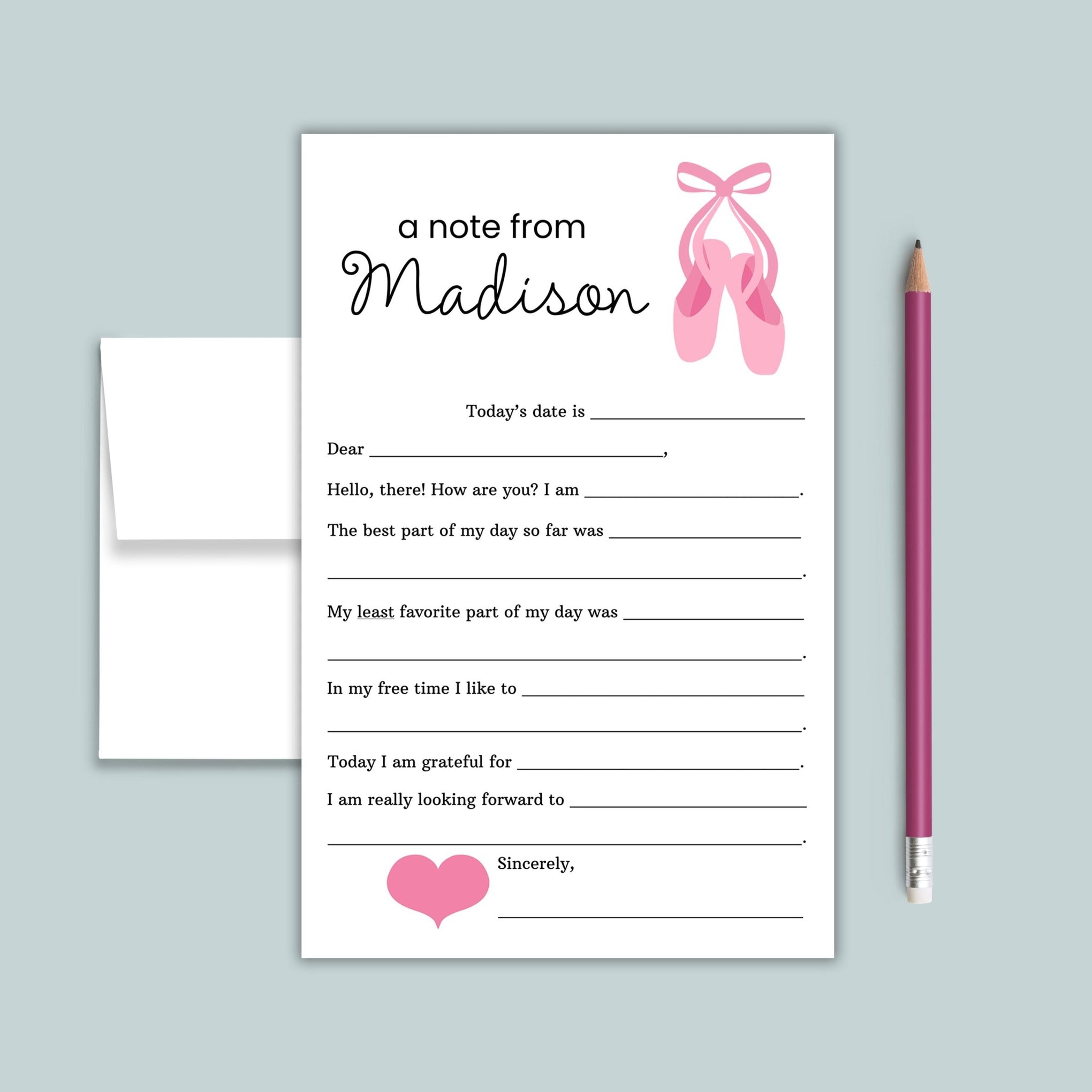 A graceful ballet design with pink ballet shoes featuring guided fill-in-the-blank prompts that make letter writing effortless for kids. These personalized templates provide sentence starters and fun prompts to help children express their thoughts while building confidence in correspondence with friends and family.