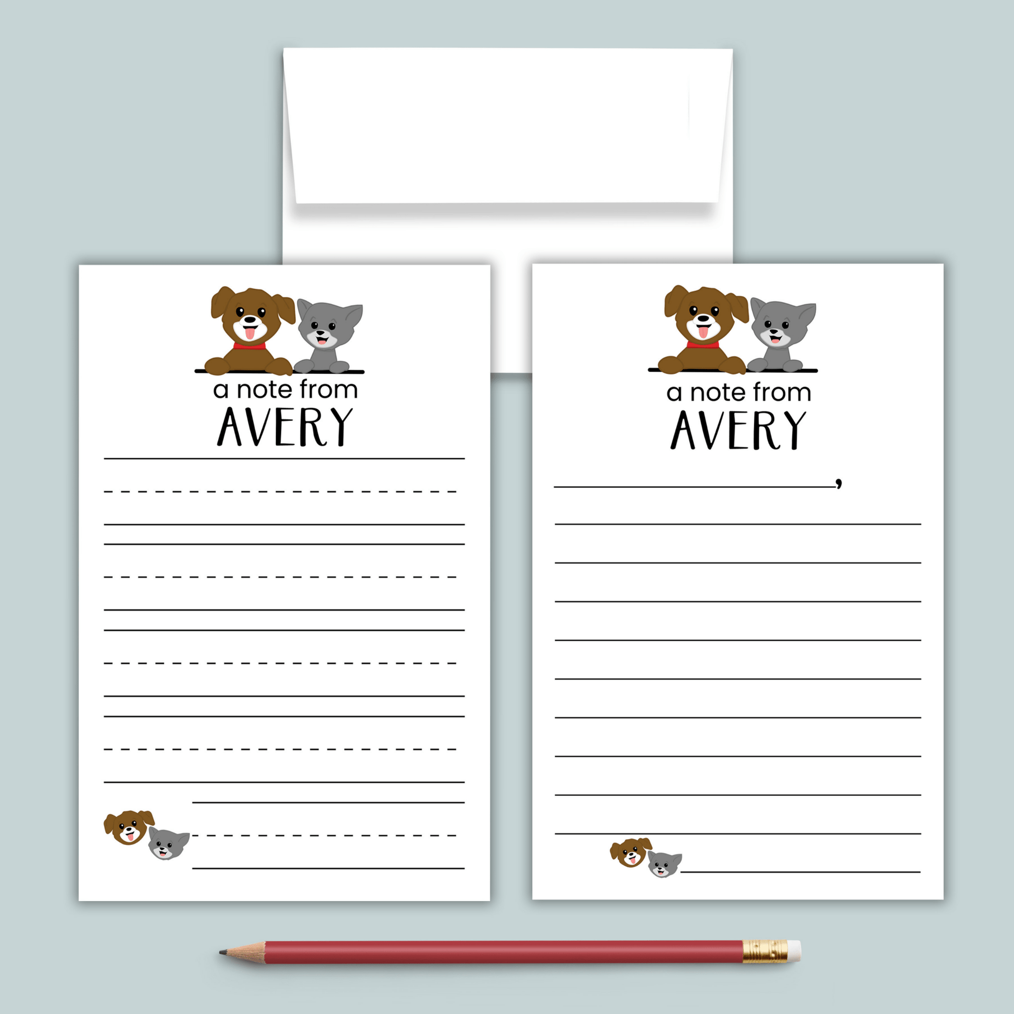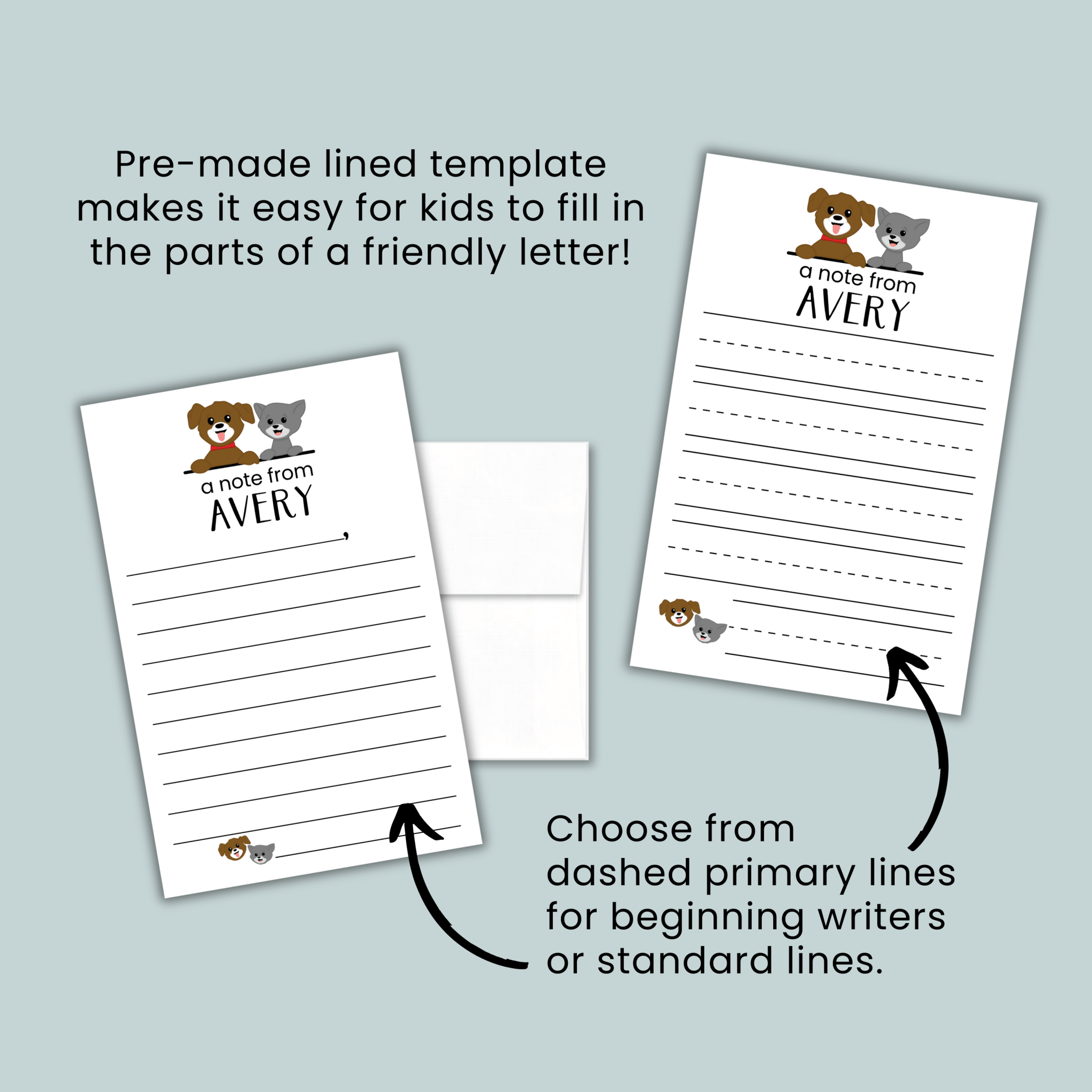 Adorable cat and dog design will inspire creativity and encourage kids to love corresponding with friends and family. Available in dashed lines for beginners or standard lines for more advanced writers, personalized templates make letter writing fun and easy.