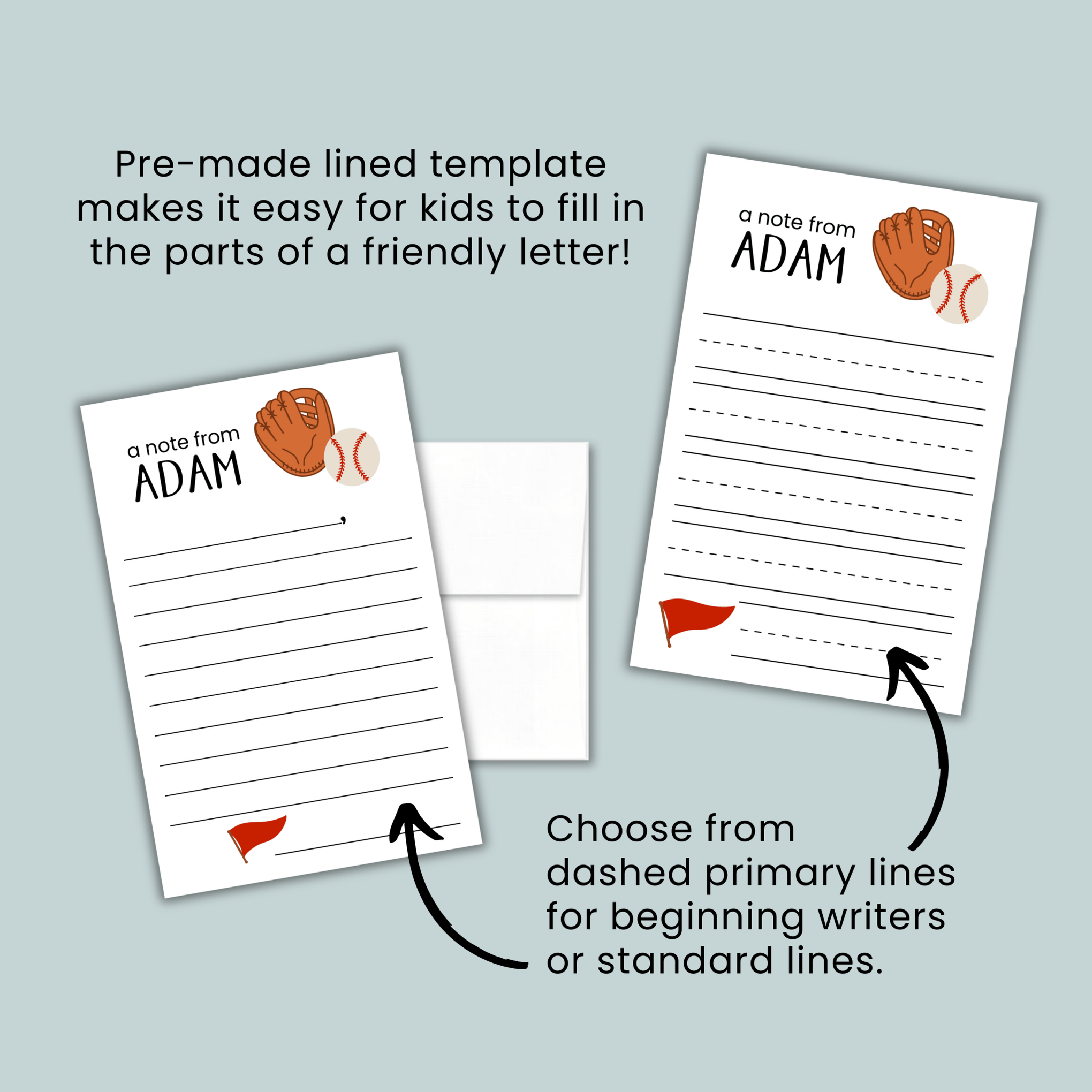This sporty baseball design will inspire creativity and encourage kids to love corresponding with friends and family. Available in dashed lines for beginners or standard lines for more advanced writers, pre-printed templates make letter writing fun and easy.