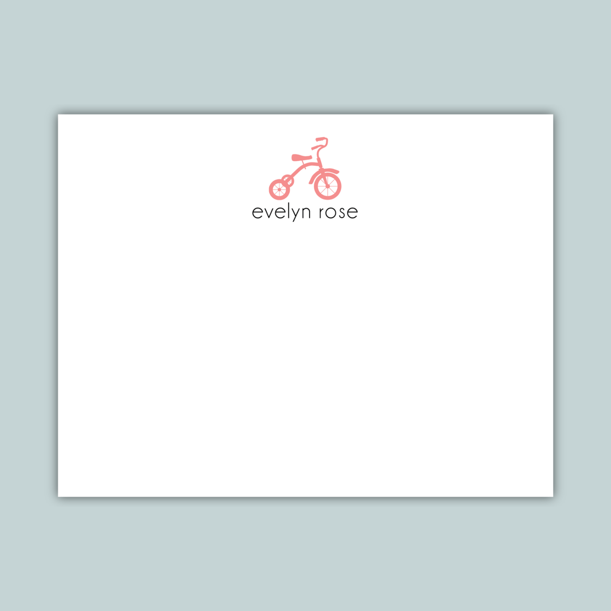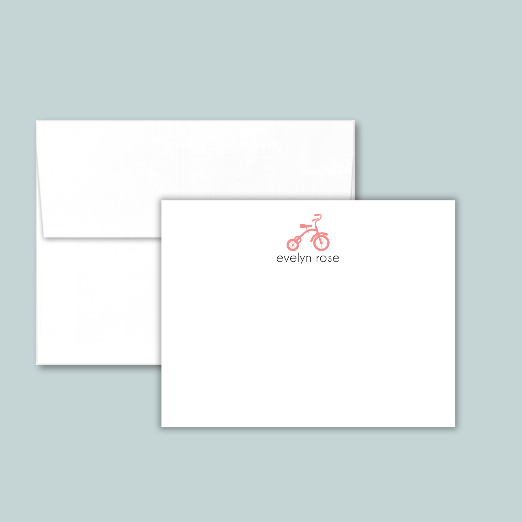 Charming and nostalgic, these sweet flat note cards feature a classic tricycle design that captures the innocence and joy of childhood. Personalize with names or custom text to create stationery perfect for children's correspondence, birthday thank-you notes, baby announcements, or anyone who loves vintage childhood charm. Ideal for little ones learning to write thank-you notes, parents sending updates, or celebrating milestones with whimsical style. A delightful design that brings smiles and memories of carefree days pedaling through childhood!