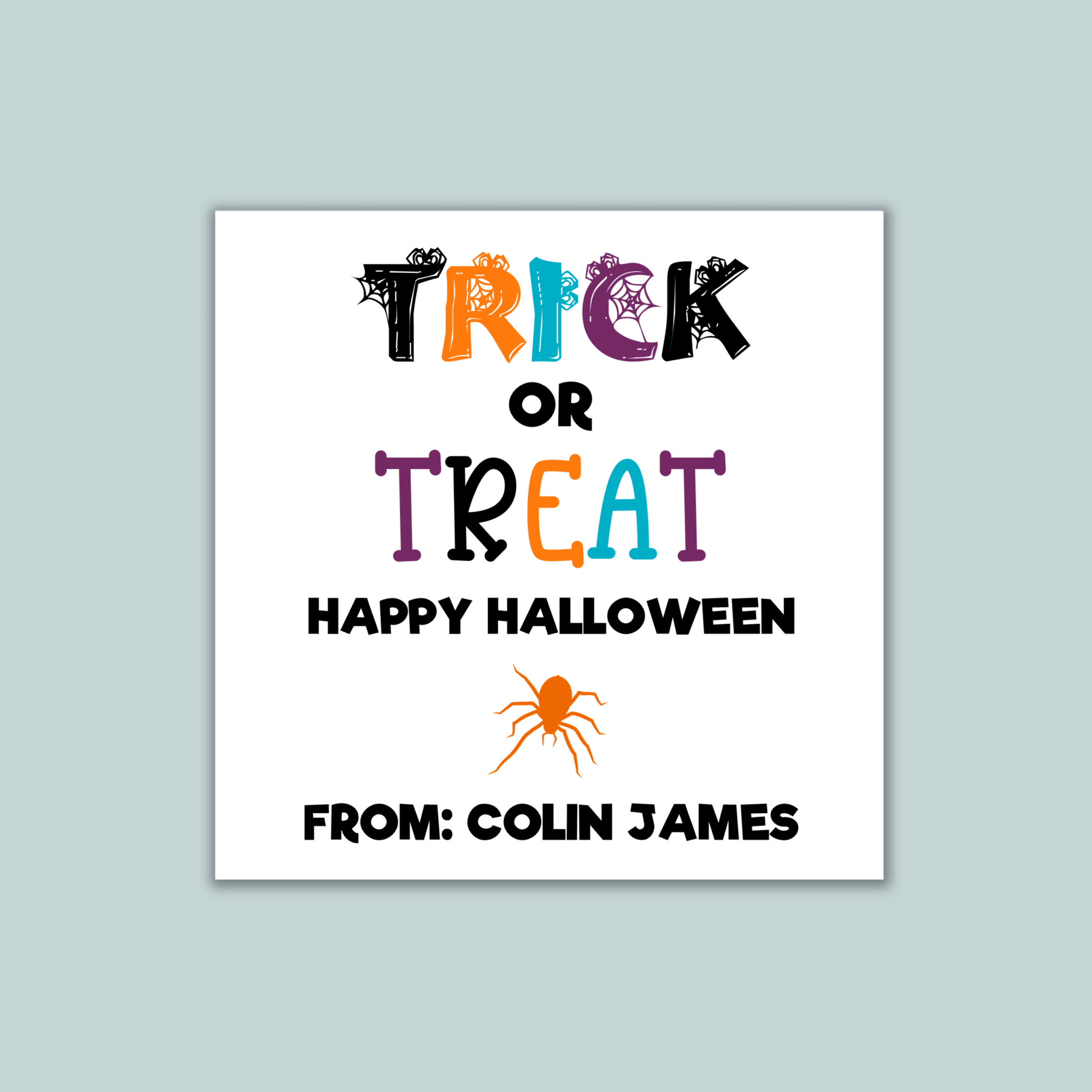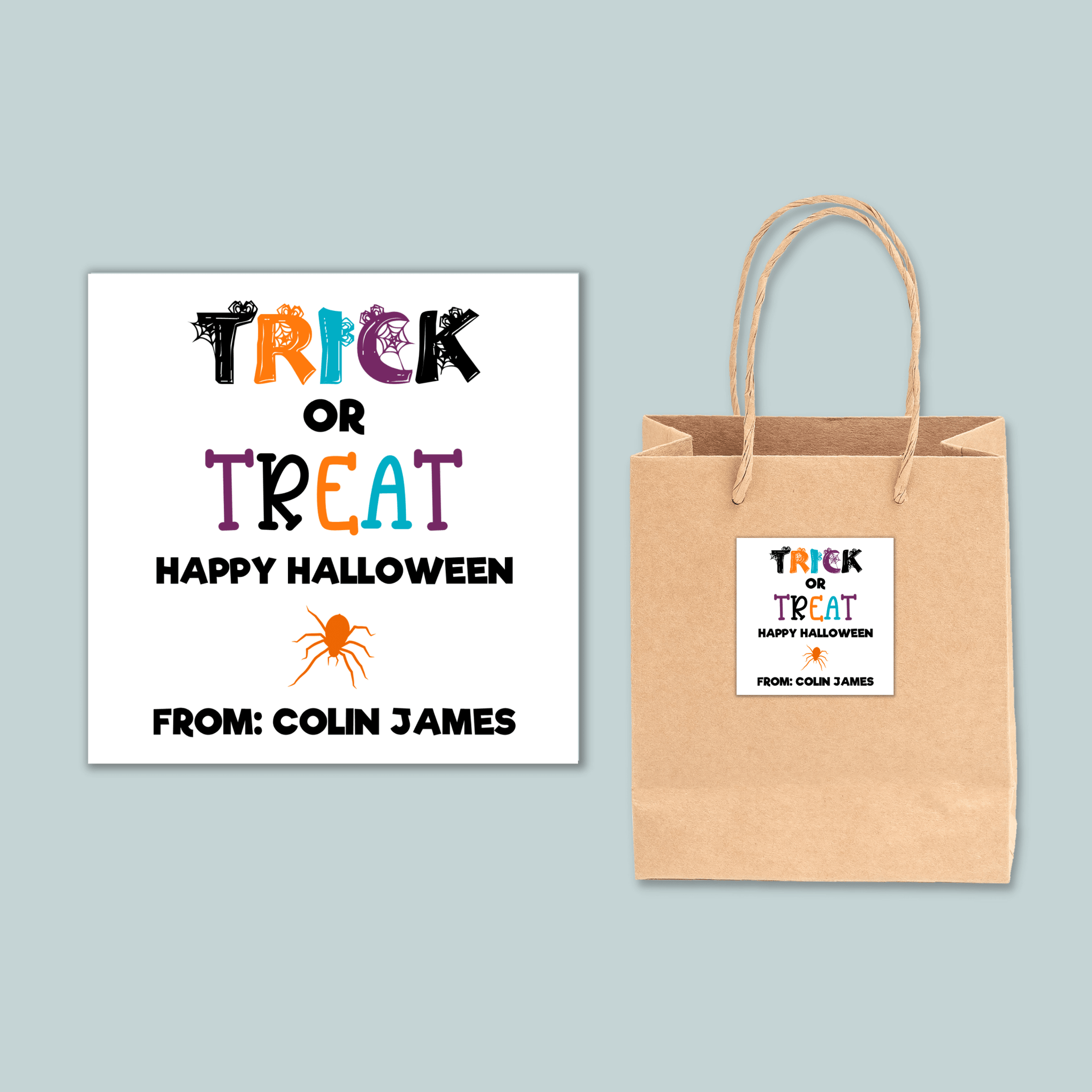 Spooky and fun, these playful square gift stickers feature a "Trick or Treat" message alongside a creepy-crawly spider design. Personalize with names or special messages to add Halloween spirit to treat bags, party favors, classroom goodies, or seasonal surprises. Perfect for sealing candy bags, decorating Halloween gifts, embellishing party invitations, or adding just the right amount of spooky fun to your October celebrations. A frightfully delightful design that's perfect for Halloween at any age!