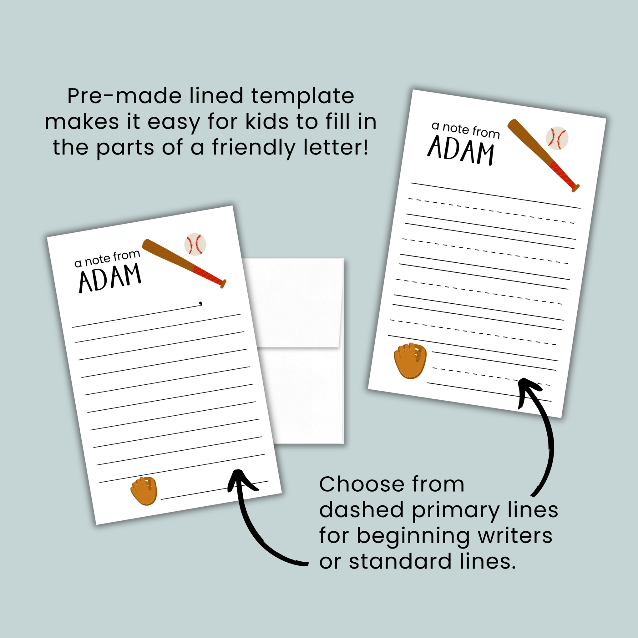 This sporty baseball design will inspire creativity and encourage kids to love corresponding with friends and family. Available in dashed lines for beginners or standard lines for more advanced writers, pre-printed templates make letter writing fun and easy.