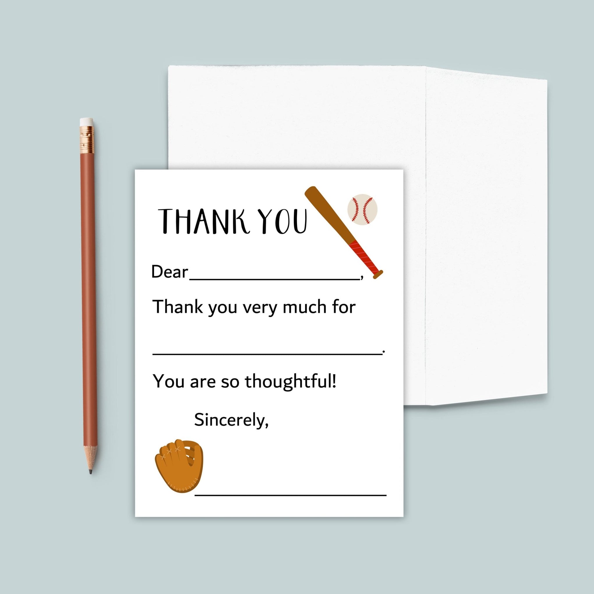 A sporty baseball design featuring simple fill-in-the-blank prompts that make writing thank you notes easy and fun for young children. These fill-in templates help little ones express gratitude with guided sentence starters perfect for birthdays, holidays, and special occasions.