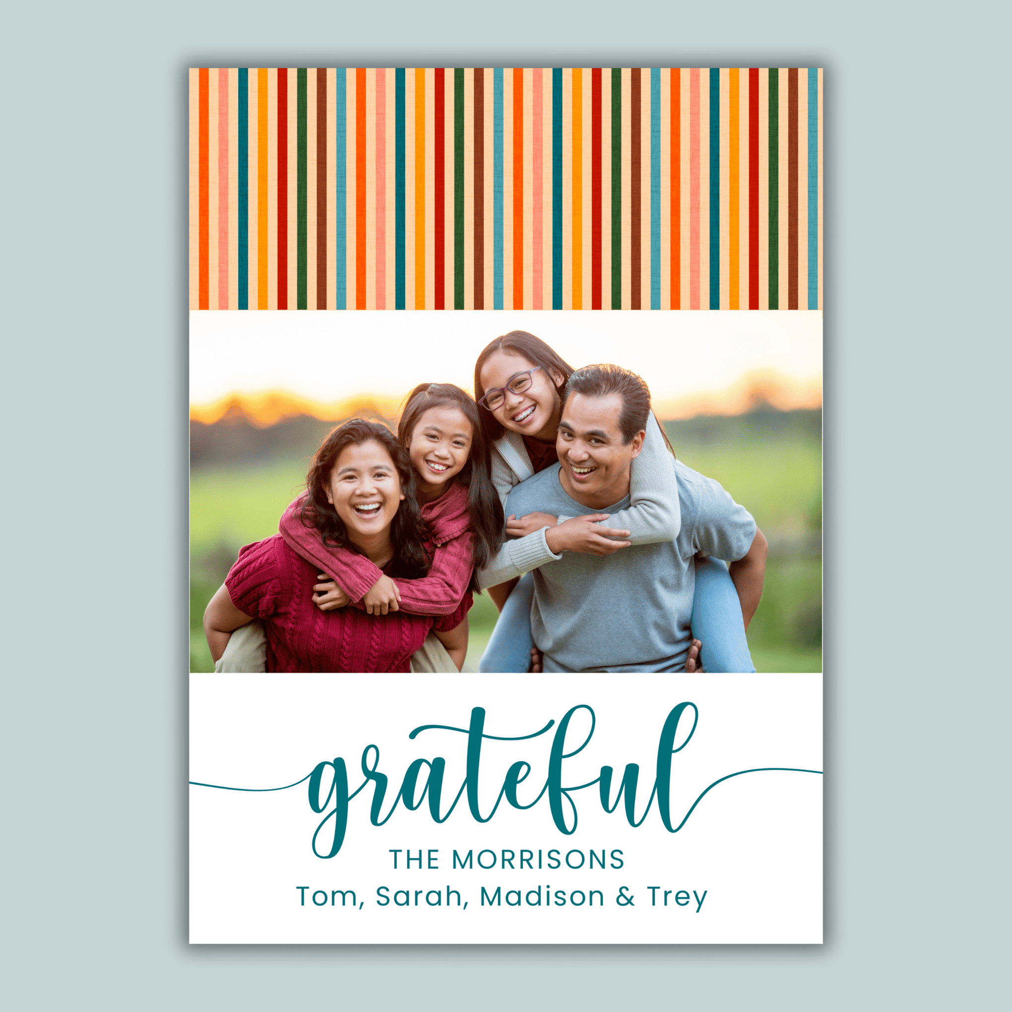 Celebrate the season of gratitude with this warm and inviting fall photo card. The beautiful autumn foliage paired with a heartfelt "grateful" sentiment and your family photos creates a meaningful way to share your thankfulness and seasonal greetings with loved ones.