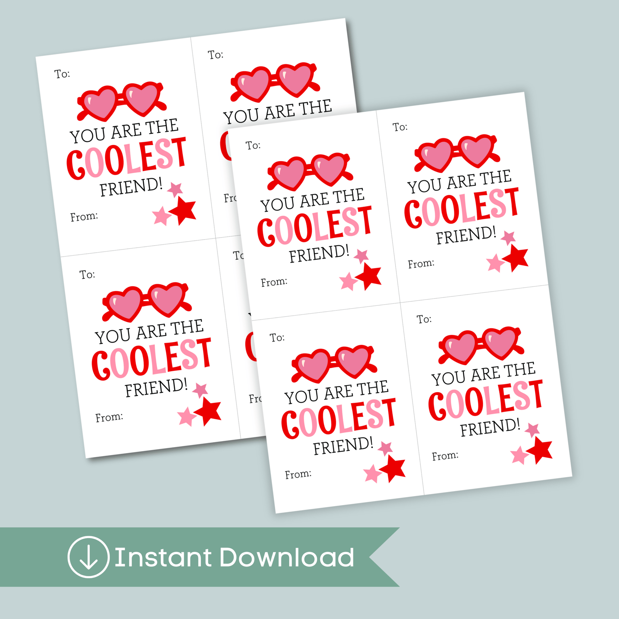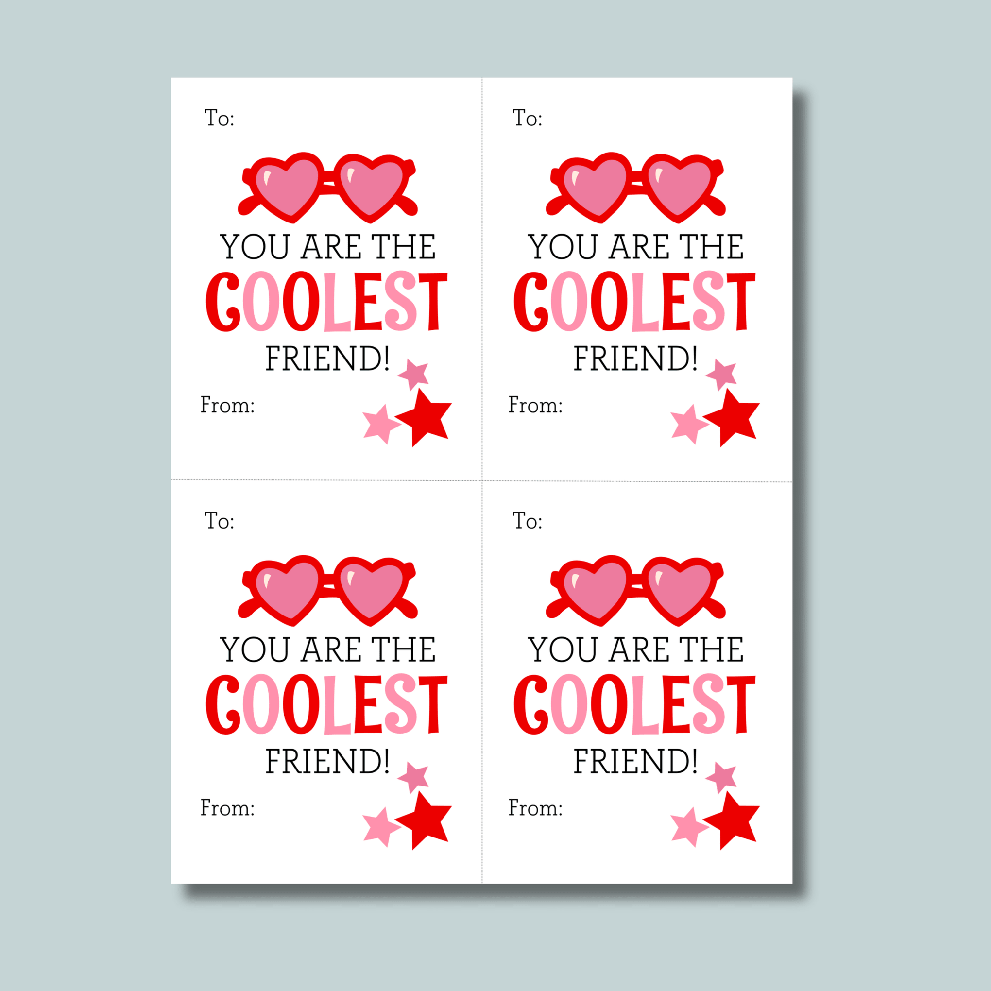 Cool printable sunglasses-themed Valentine's Day cards perfect for classroom exchanges! These fun "You're the COOLEST friend" cards are ideal for boys and girls to give their classmates. A cool way for kids to share friendship on Valentine's Day with a fun sunglasses theme!