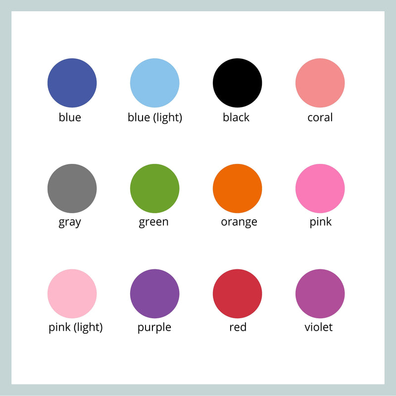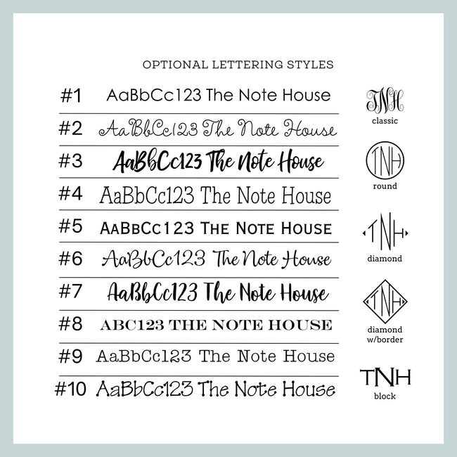 If you prefer one of the fonts or colors below, please include any change in the "Special Requests" box at the bottom of each product page.