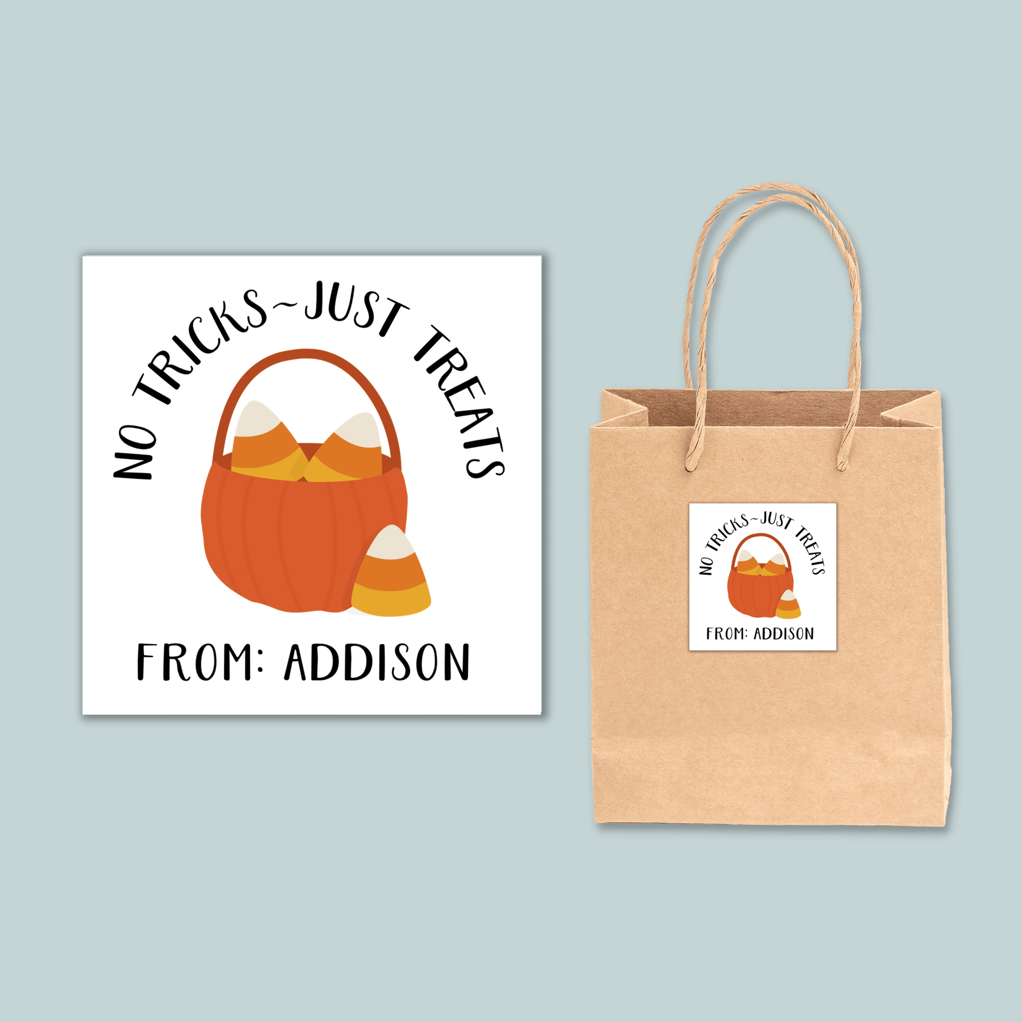 Adorable candy corn in a pumpkin basket is the perfect addition to your Halloween treat bags. Personalized self-sticking gift labels are fun, functional, and make gift-giving simpler!